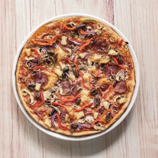 Tomato base, Cheese, Ham, Mushrooms, Capsicum, Onions, Pineapple, Bacon, Olives, Cheese on top.Choose one